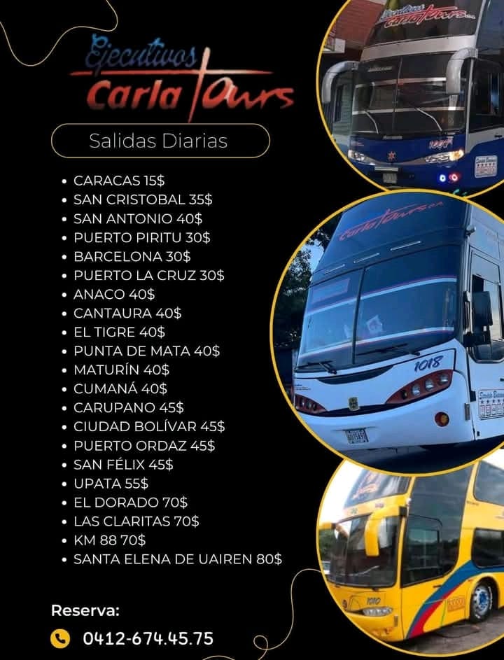 ¿Planeas viajar a San Cristóbal, Caracas o el Oriente del país? No pierdas tiempo ni dinero trasladándote a los terminales para consultar disponibilidad. Este enlace en Yaritagua es tu taquilla virtual autorizada de Ejecutivos Carla Tours para todo el estado Yaracuy. Gestionamos tu viaje con la flota de buses más moderna de Venezuela, garantizando tu puesto con un solo mensaje.